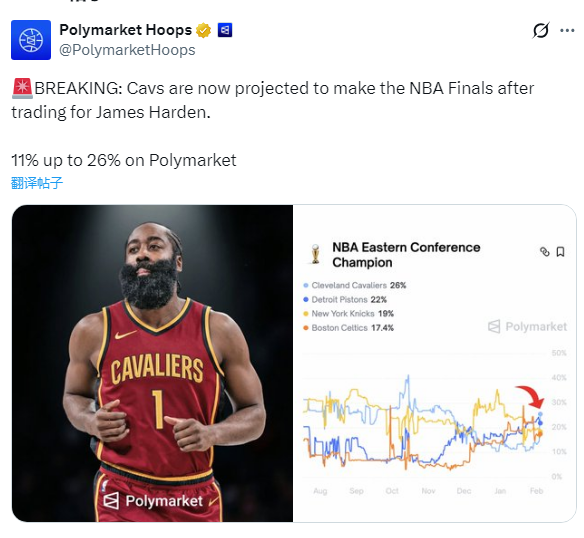 哈登加盟骑士后,骑士队打进总决赛的概率从11%升到26%。