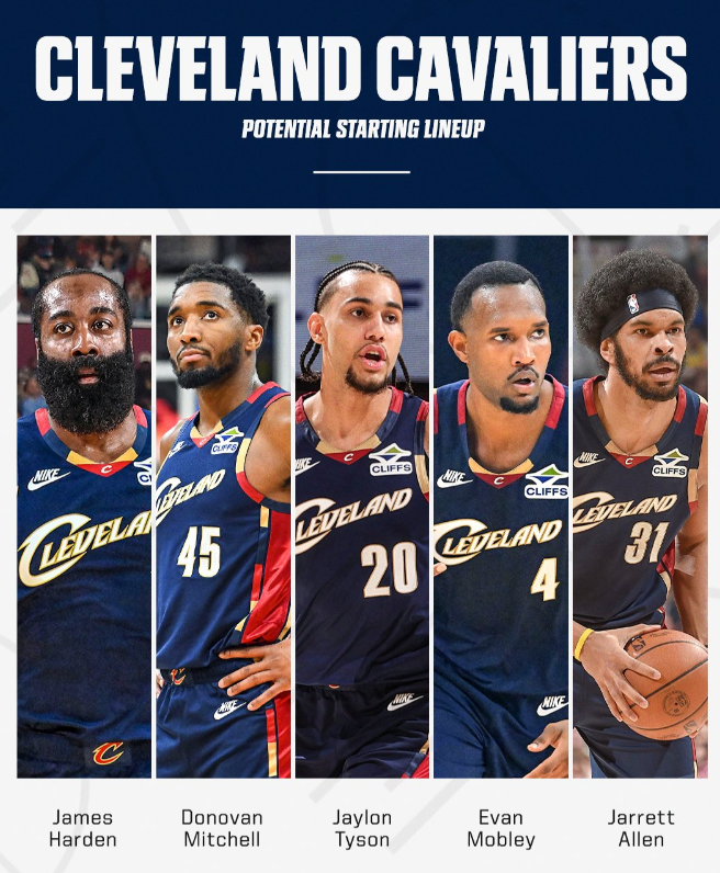 骑士的预计首发阵容——哈登、米切尔、泰森、莫布里、贾勒特-阿伦