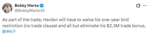 据薪资专家Bobby Marks报道,作为交易一部分,哈登不得不放弃自己的交易否决权,同时几乎完全放弃了他230万美元的交易保证金(15%)。